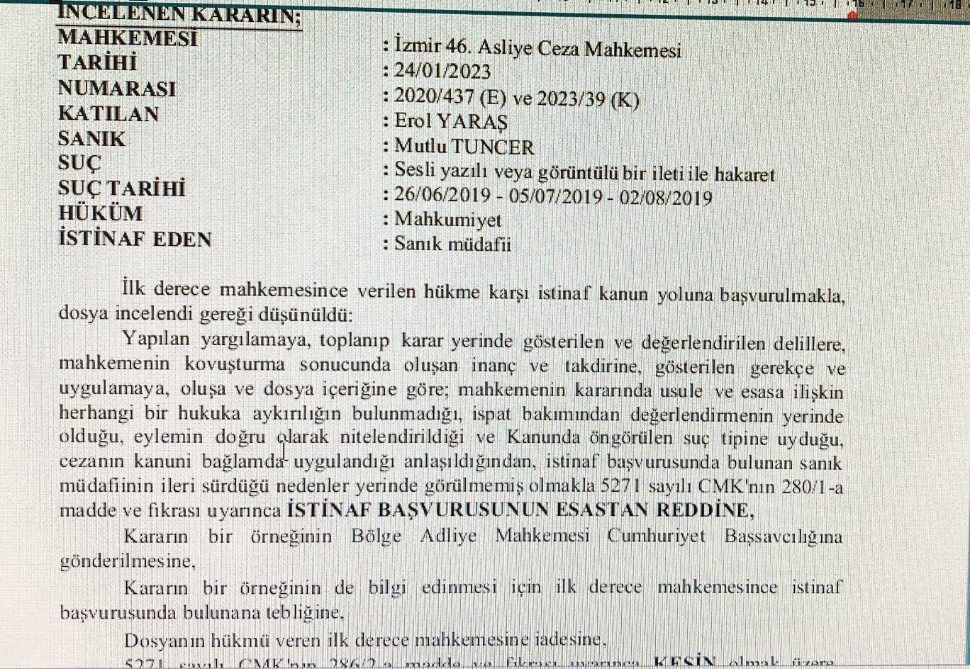 Mutlu Tuncer, Gazeteci Erol Yaraş’a hakaret ettiği gerekçesiyle yargılandığı 46.Asliye Ceza Mahkemesi, Türk Ceza Kanunu’nun 5237 sayılı maddesinin 125/2-1 fıkrasına göre 3 ay 19 gün hapis cezası ile cezalandırılmasına, yine aynı suçtan “1 yıl denetim süresine tabi tutulmasına” karar verilmişti.