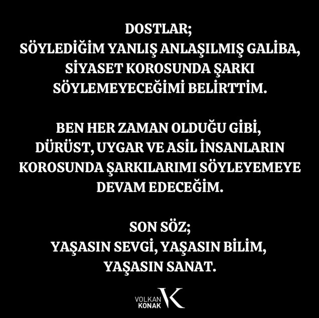 Sabah Instagram hesabından bir paylaşım yapan Volkan Konak "Ülkemizde ve orta doğuda siyasi partiler ya tarikat ya tek adam sistemidir ve de siyaset yapan kişilerin zenginleşme alanıdır. Vefasız ve sevgisiz bu siyaset korosunda şarkı söylemem. Dolayısıyla beni silin, ben yokum" dediği için müziği bıraktığı iddia edildi.