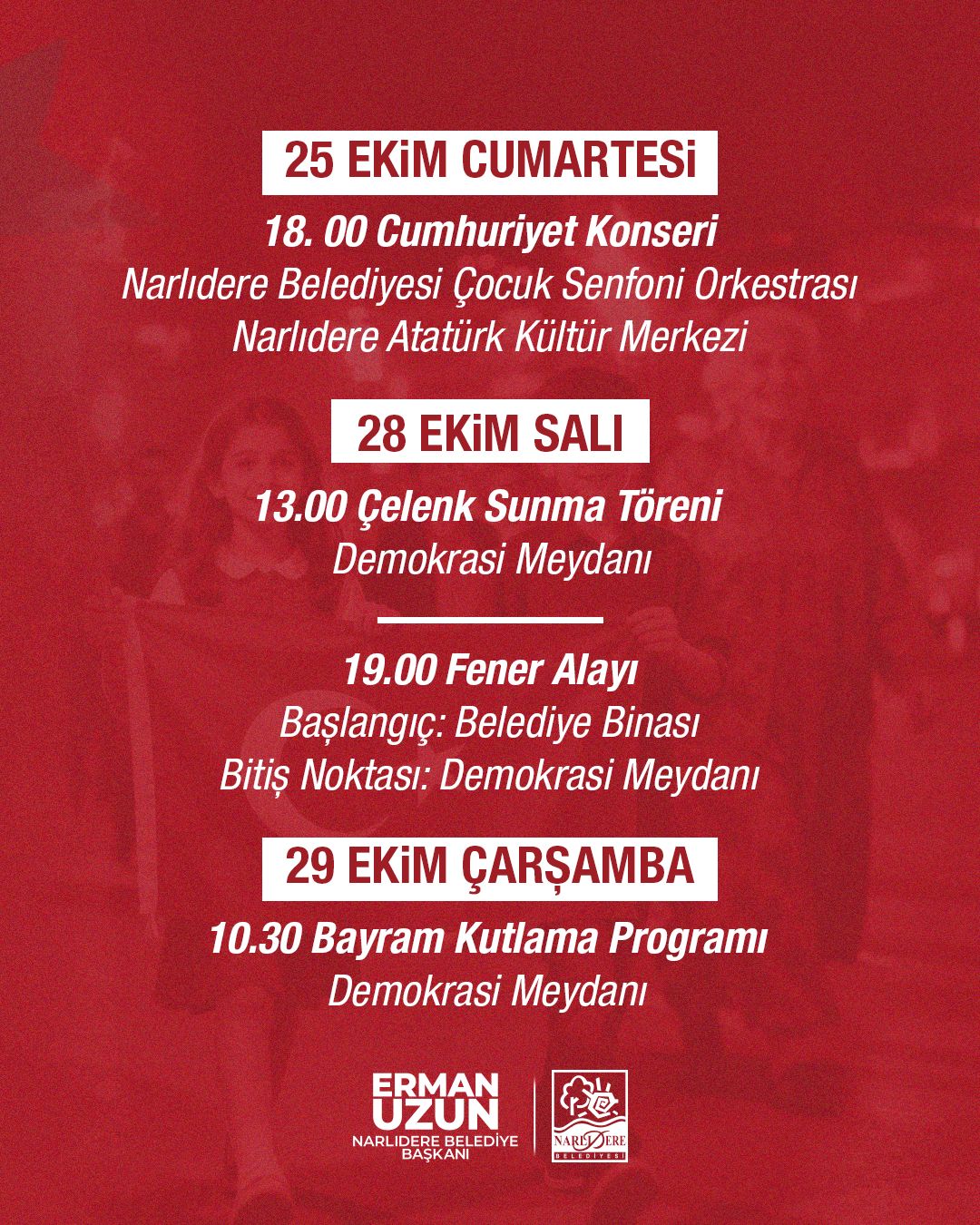 28 Ekim Salı günü saat 13.00'te Demokrasi Meydanı'nda yapılacak resmi çelenk sunum törenin ardından ise saat 19.00'da Narlıdere Cumhuriyet Işığı ile aydınlanacak. Saat 19.00'da Belediye binası önünden başlayacak fener alayı ve kortej yürüyüşü Demokrasi Meydanı'nda son bulacak. Narlıdereliler, fener alayı ile Cumhuriyet'in ışığını bir kez daha gökyüzüne taşıyacak.