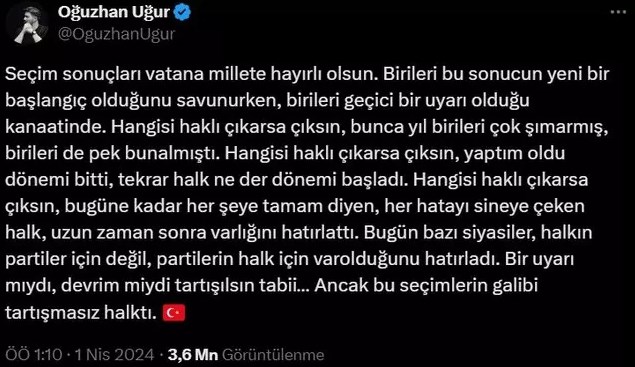"Seçim sonuçları vatana millete hayırlı olsun" diyen Oğuzhan Uğur şunları yazdı: