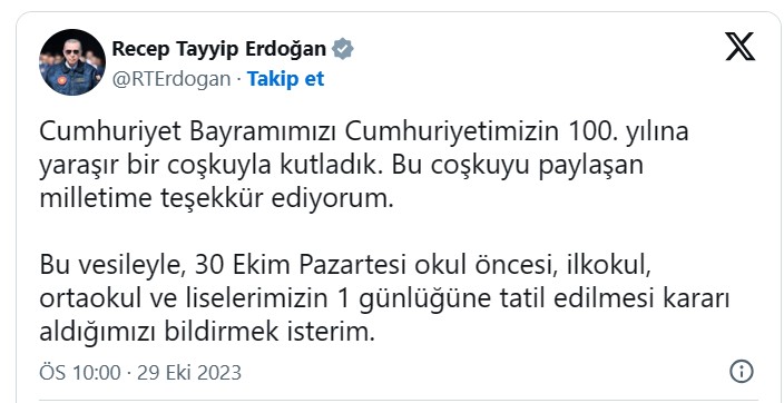 Cumhuriyet Bayramımızı Cumhuriyetimizin 100. yılına yaraşır bir coşkuyla kutladık. Bu coşkuyu paylaşan milletime teşekkür ediyorum. Bu vesileyle, 30 Ekim Pazartesi okul öncesi, ilkokul, ortaokul ve liselerimizin 1 günlüğüne tatil edilmesi kararı aldığımızı bildirmek isterim.