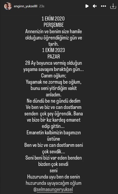 Acı haberi Instagram hesabından duyuran Engin Yüksel, "1 Ekim 2020 annenizin ve benim size hamile olduğunu öğrendiğimiz gün ve tarih. 1 Ekim 2023. 28 ay boyunca vermiş olduğun yaşama savaşını bıraktığın gün. Canım oğlum yaşamak ne zormuş be, bunu seni yitirdiğim vakit anladım. 'Ne dündü be, ne gündü' dedim ve ben ve biz can dostlarım senden çok şey öğrendik. Bana ve bize bir kız kardeş emanet edip gittin. Emanetin kalbimizin başımızın üstüne. Ben ve biz ve can dostlarım seni çok sevdik. Seni, beni, bizi var eden benden, bizden çok sevdi seni. Huzurunda uyu, ben de senin huzurunda uyuyacağım oğlum" ifadelerini kullandı.
