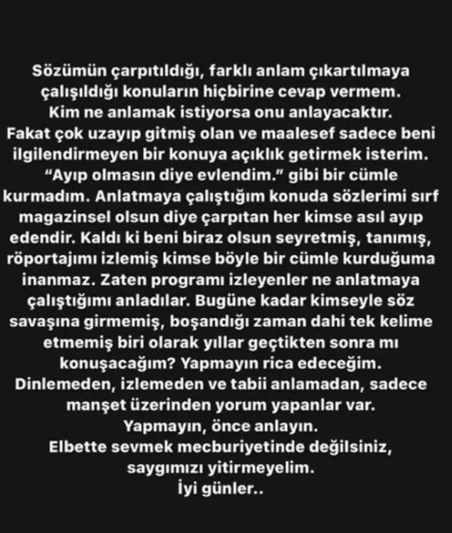 "Sözümün çarpıtıldığı, farklı anlam çıkartılmaya çalıştığı konuların hiçbirine cevap vermem. Kim ne anlamak istiyorsa onu anlayacaktır. Fakat çok uzayıp gitmiş olan ve maalesef sadece beni ilgilendirmeyen bir konuya açıklık getirmek isterim. "Ayıp olmasın diye evlendim" gibi bir cümle kurmadım. Anlatmaya çalıştığım konuda sözlerimi sırf magazinsel olsun diye çarpıtan her kimse asıl ayıp edendir. Kaldı ki beni biraz olsun seyretmiş, tanımış, röportajımı izlemiş kimse böyle bir cümle kurduğuma inanmaz. Zaten programı izleyenler ne anlatmaya çalıştığımı anladılar. Bugüne kadar kimseyle söz savaşına girmemiş, boşandığı zaman dahi tek kelime etmemiş biri olarak yıllar geçtikten sonra mı konuşacağım? Yapmayın rica edeceğim.Dinlemeden, izlemeden ve tabii anlamadan, sadece manşet üzerinden yorum yapanlar var. Yapmayın, önce anlayın. Elbette sevmek mecburiyetinde değilsiniz, saygımızı yitirmeyelim. İyi günler...