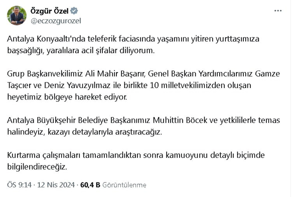 Özel, 10 milletvekilinden oluşan bir ekibin bölgeye giderek incelemelerde bulunacağını belirten Özel, "Antalya Konyaaltı'nda teleferik faciasında yaşamını yitiren yurttaşımıza başsağlığı, yaralılara acil şifalar diliyorum. Grup Başkanvekilimiz Ali Mahir Başarır, Genel Başkan Yardımcılarımız Gamze Taşcıer ve Deniz Yavuzyılmaz ile birlikte 10 milletvekilimizden oluşan heyetimiz bölgeye hareket ediyor. Antalya Büyükşehir Belediye Başkanımız Muhittin Böcek ve yetkililerle temas halindeyiz, kazayı detaylarıyla araştıracağız. Kurtarma çalışmaları tamamlandıktan sonra kamuoyunu detaylı biçimde bilgilendireceğiz" ifadesini kullandı.