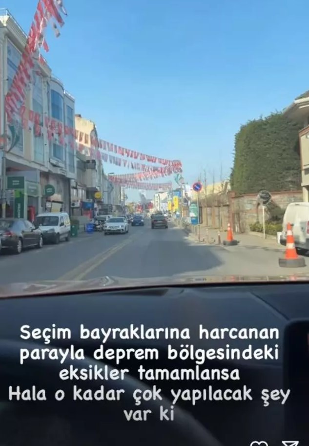 Aracından bir paylaşım yapan Pınar Altuğ "Şu seçim bayraklarına vs harcanacak masraf bütün partiler için söylüyorum, şunlara harcanan parayla deprem bölgelerine neler neler yapılırdı. Çok üzgünüm yani gerçekten üzgünüm hale bak. Buna harcanan ödenek, deprem bölgesine gitse, ihtiyacı olanlara gitse ne güzel olur di mi?" dedi.