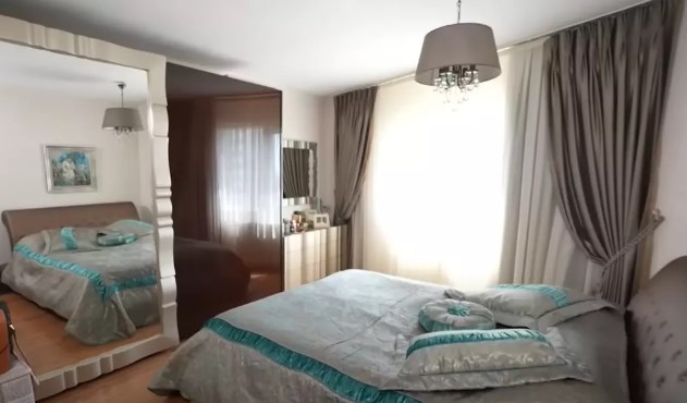 Küçük yatak odasında yatak karşısındaki kocaman ayna ise dikkatlerden kaçmıyor. Aynayı görenlerin aklına da elbette tüm yatak odası ayna olan Erman Toroğlu geliyor.