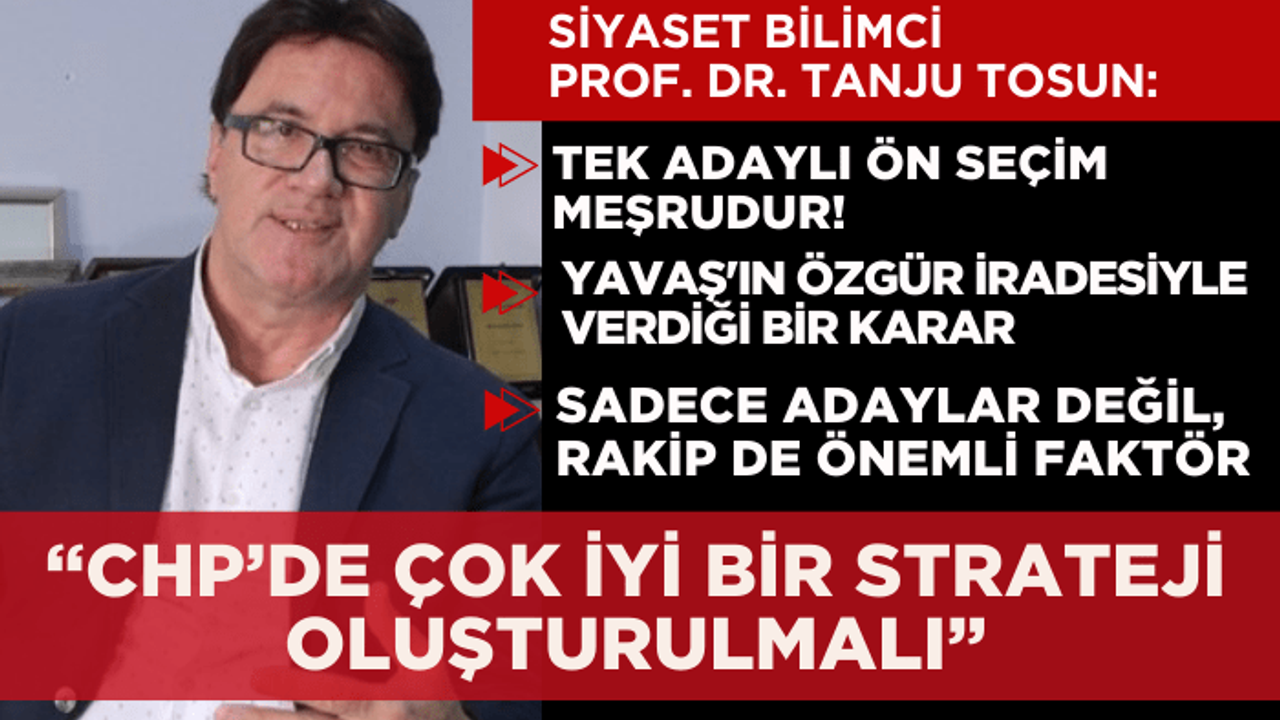 CHP'de tek adayla ön seçim yapılıp yapılamayacağını siyaset bilimi açısından ele alan Prof. Dr. Tosun, “Tek adaylı ön seçim dünyada farklı ülkelerde uygulanıyor. Aynı parti içinde düşündüğümüzde tek aday ile birden fazla adayda önemli olan bir; seçmen desteği, iki; adayın popülaritesi çok önemli. Tek adayla girilmesi meşrudur değildir tartışmaları yapılıyor. Tabii ki meşrudur. Dünyada örnekleri de vardır. Parti ön seçime tek adayla gittiğinde, ön seçimden çıkıyor. Bu meşrudur, sonuçta bir tercih belirtiyor. Siyaset bilimi açısından bu tartışmaların önemi yok.” dedi.