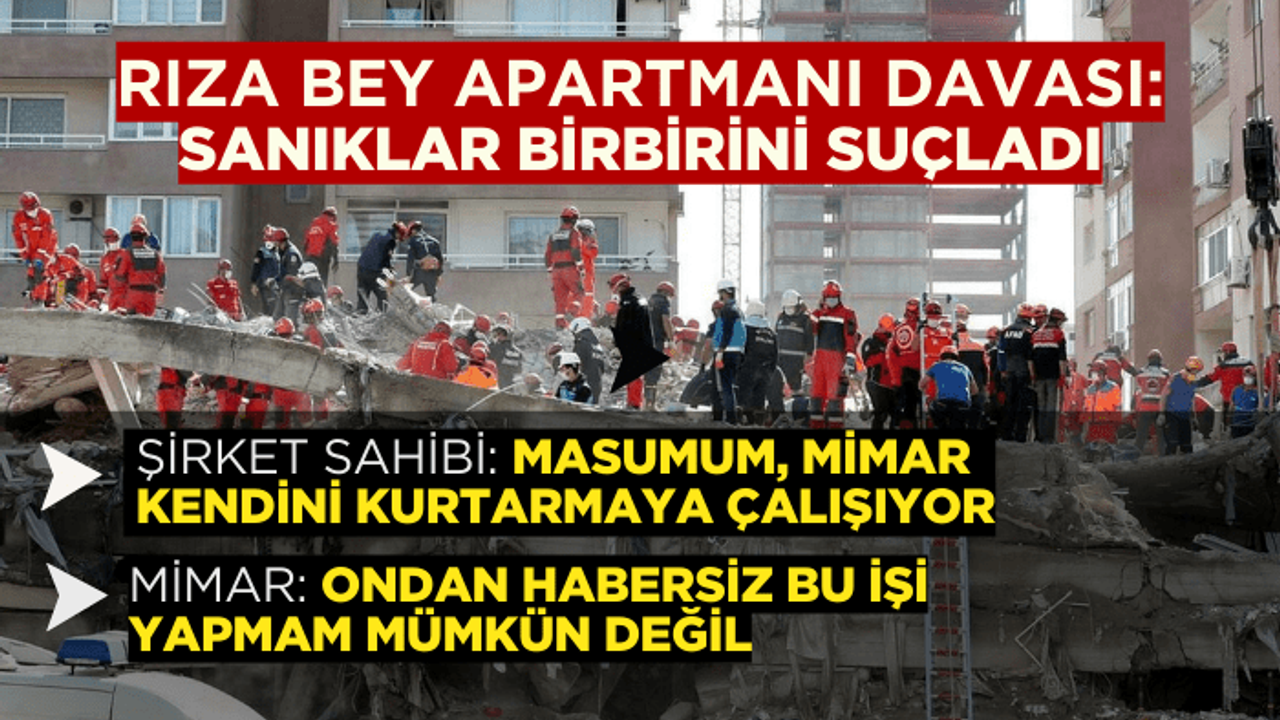 Öte yandan o dönem Bayraklı Belediyesi fen işleri müdür vekili sıfatıyla imzası bulunan Gamze E. (52) ve eski Bornova Belediyesi İmar Müdürü Mehmet Ali U. (69) hakkında 'Görevi kötüye kullanma' suçundan İzmir 13'üncü Asliye Ceza Mahkemesi'nde dava açıldı. İzmir Bölge Adliye Mahkemesi 23'üncü Ceza Dairesi, oy birliğiyle her iki dosyanın birleştirilmesine karar verdi. Böylelikle Rıza Bey Apartmanı davasında sanık sayısı, 15'e yükseldi. 5'inci Ağır Ceza Mahkemesi'nde geçen yıl ekim ayında görülen davanın duruşmasında; mahkeme heyeti, tutuklu sanıklar müteahhit H.H.Ö'nün konutu terk etmeme, mimar Ali Serdar Bayram'ın ise yurt dışı çıkış yasağı adli kontrol şartlarıyla tahliyelerine karar verdi. Böylelikle davada tutuklu sanık kalmazken, aileler tepki gösterdi.