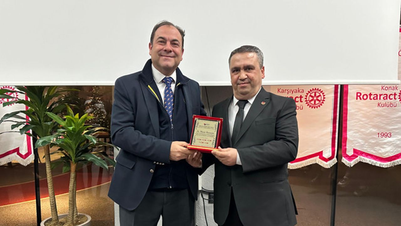 Fotoaltı: Ekonomi Muhabirleri Derneği İzmir Şubesi Başkanı ve İzmir Basın Grubu Moderatörü Murat Demircan'a Meslek Hizmetleri Ödülünü, Uluslararası Rotary 2440. Bölge Gelecek Dönem Guvernörü Mert Korur takdim etti.