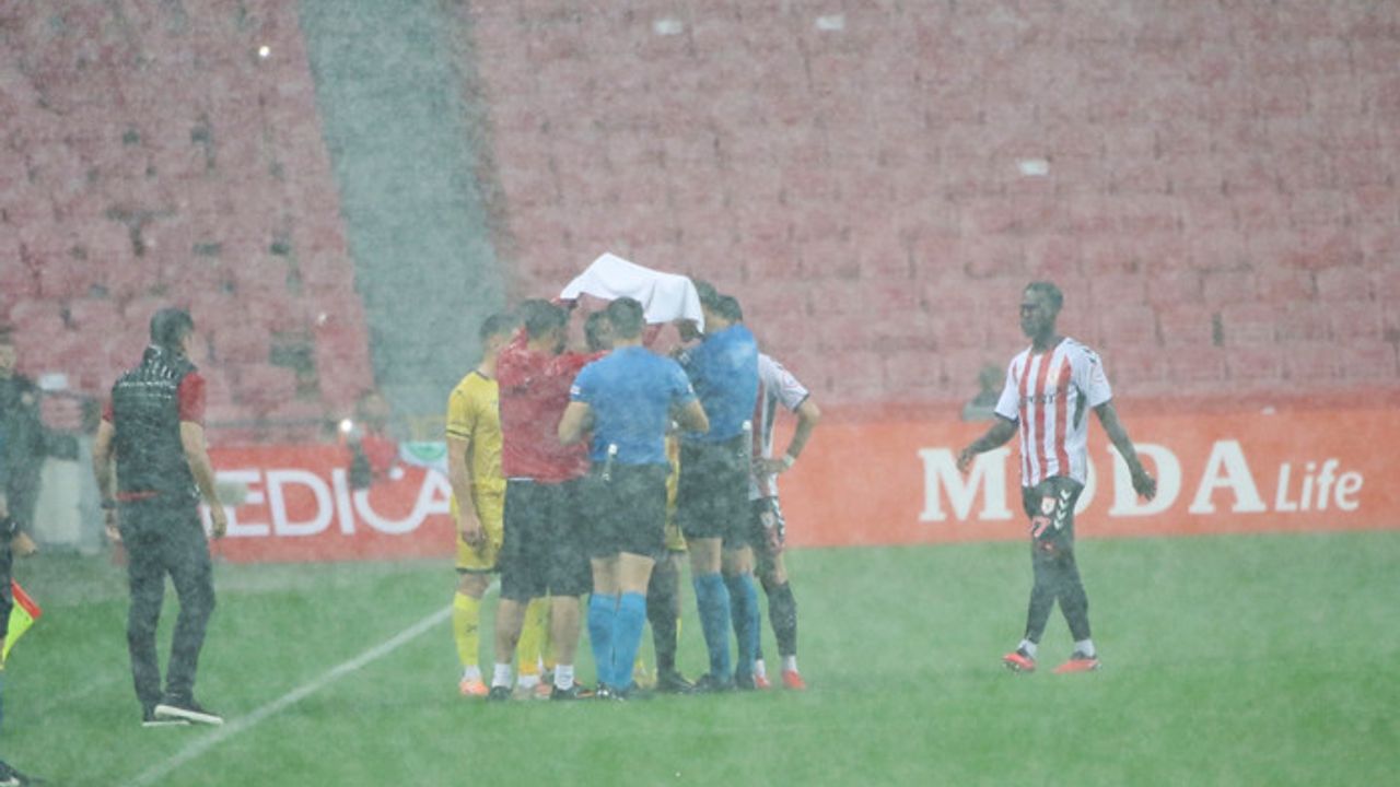 Görevlilerin yoğun çabasına karşın yağışın devam ettiği Samsun'da zeminde biriken su boşaltılamadı. Ardından mücadelenin hakemi Burak Şeker, iki takım teknik direktörleri ve kaptanları ile zemini yeniden inceledi. Yapılan incelemenin ardından saha zemininin futbol oynamaya elverişli olmadığı kararını veren hakem Burak Şeker, mücadeleyi erteledi.