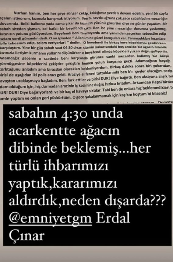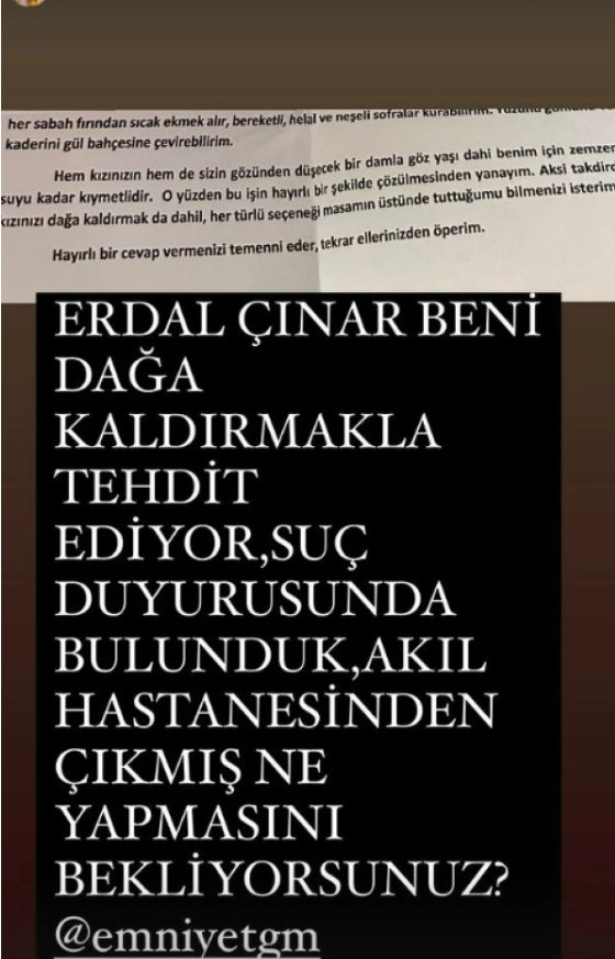 Erdal Çınar'ın annesine gönderdiği notları da emniyeti etiketleyerek paylaşan Ece Erken, "Erdal Çınar beni dağa kaldırmakla tehdit ediyor. Suç duyurusunda bulunduk. Akıl hastanesinden çıkmış ne yapmasını bekliyorsunuz?" ifadelerini kullandı.