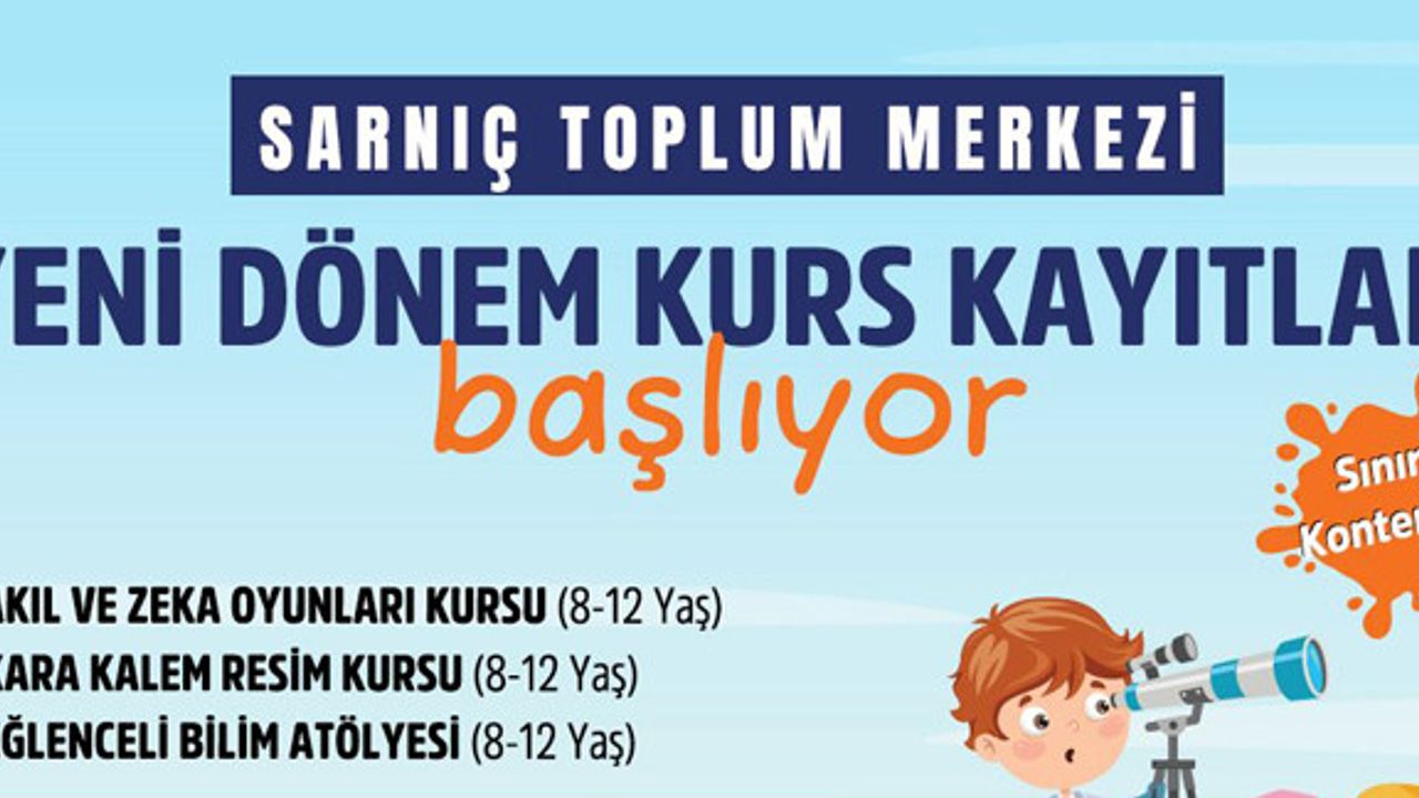 Merkezdeki çocuk kurslarına üç farklı branşta yeni kurs eklenecek. 8-12 yaş aralığındaki çocuklar için düzenlenecek akıl ve zeka oyunları, karakalem resim kursu ve eğlenceli bilim atölyesinin kayıtları başladı. Kurs kayıtları 26 Ocak Cuma gününe kadar devam edecek. Kayıt yaptırmak isteyenler 0232 999 02 51 numarasını arayıp 1205 dahili numarasından detaylı bilgi alabilecek.