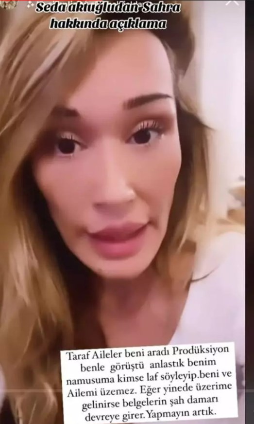 Paylaşımların ardından yaşananları sineye çektiğini belirten Seda, mesajları yayından kaldırarak "Taraf aileler beni aradı, prodüksiyon benimle görüştü anlaştık. Kimse benim namusuma laf söyleyip beni ve ailemi üzemez. Eğer yine üzerime gelinirse belgelerin şah damarı devreye girer. Yapmayın artık" dedi.