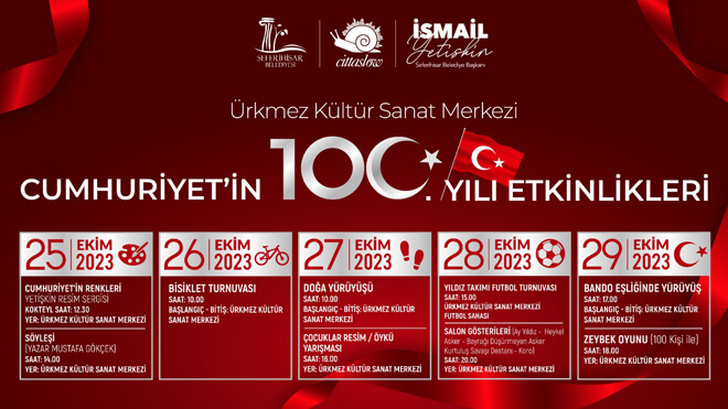 25 Ekim Çarşamba günü başlayacak etkinlikler, 29 Ekim’e kadar devam edecek. Etkinlikler 25 Ekim Çarşamba günü saat: 12.30’da Ürkmez Kültür Sanat Merkezi’nde düzenlenecek olan “Cumhuriyetin Renkleri” resim sergisiyle başlayacak. Aynı gün saat:14.00’da ise yazar Mustafa Gökçek’in söyleşisi gerçekleşecek. 26 Ekim Perşembe saat:10.00’da ise Bisiklet Turnuvası ile Cumhuriyet coşkusu, Seferihisar sokaklarına taşınacak. 27 Ekim Cuma günü saat:10.00’da ilçe halkıyla doğa yürüyüşü gerçekleştirecek olan belediye, aynı gün saat:16.00’da Ürkmez Kültür Sanat Merkezi’nde resim ve öykü yarışması düzenleyecek. Kutlamaların dördüncü günü olan 28 Ekim Cumartesi günü saat:15.00’da Ürkmez Kültür Sanat Merkezi Futbol Sahasında Yıldız Takımı Futbol Turnuvası düzenlenecek. Atatürkçü Düşünce Derneği de 15.00’da Cumhuriyet Meydanı’nda basın açıklaması yapacak. Akarca Kadın Platformu da Çarşı merkezinde saat 15.45’te zeybek gösterisi yapacak. Aynı gün saat: 20.00’dan itibaren Ürkmez Gençlik Merkezi’nde salon gösterileri gerçekleştirilecek.