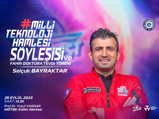 Selçuk Bayraktar’ın konuk olacağı etkinlik 26 Eylül Salı günü Ege Üniversitesi Prof. Dr. Yusuf Vardar MÖTBE Kültür Merkezinde, saat 14.00’te başlayacak. Etkinlik kapsamında Bayraktar’a Ege Üniversitesi Senatosu kararınca “Fahri Doktora” unvanı tevdi edilecek.
