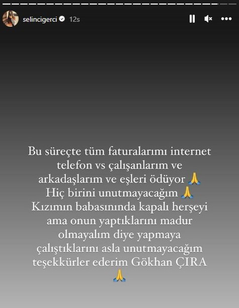 Bu süreçte faturalarını arkadaşlarının eşlerin ödediğini ve eski eşi Gökhan Çıra'nın kendisine destek olduğunu söyleyen Ciğerci, "Bu süreçte tüm faturalarımı internet, telefon vs. çalışanlarım, arkadaşlarım ve eşleri ödüyor. Hiç birini unutmayacağım. Kızımın babasının da kapalı her şeyi ama onun yaptıklarını, mağdur olmayalım diye yapmaya çalıştıklarını asla unutmayacağım. Teşekkür ederim Gökhan Çıra" ifadelerini kullandı.