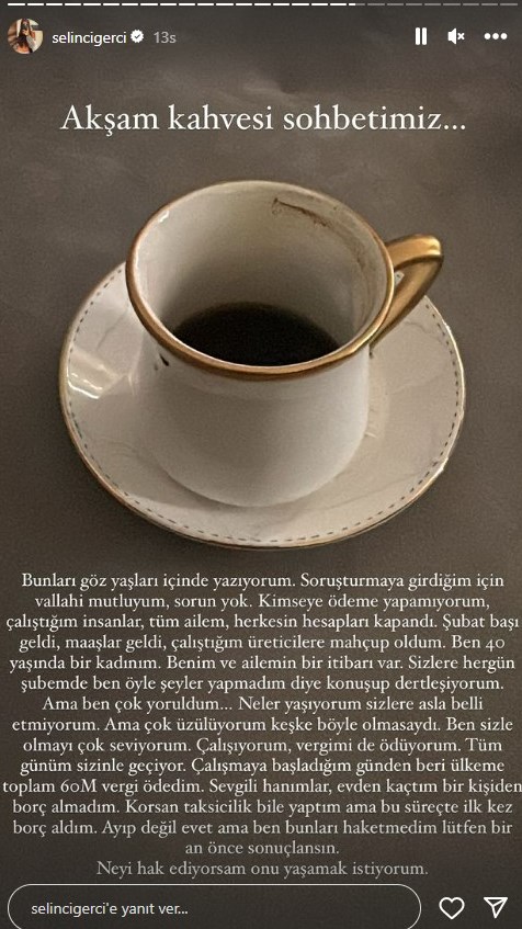 Instagram hesabından takipçilerine içini döken Selin Ciğerci, "Bunları gözyaşları içinde yazıyorum. Soruşturmaya girdiğim için vallahi mutluyum, sorun yok. Kimseye ödeme yapamıyorum, çalıştığım insanlar, tüm ailem, herkesin hesapları kapandı. Şubat başı geldi, maaşlar geldi, çalıştığım üreticilere mahcup oldum. Ben 40 yaşında bir kadınım. Benim ve ailemin bir itibarı var. Sizlere her gün şubemde ben öyle şeyler yapmadım diye konuşup dertleşiyorum. Ama ben çok yoruldum. Neler yaşıyorum sizlere asla belli etmiyorum ama çok üzülüyorum keşke böyle olmasaydı. Ben sizinle olmayı çok seviyorum. Çalışıyorum, vergimi de ödüyorum. Tüm günüm sizinle geçiyor. Çalışmaya başladığım günden beri ülkeme toplam 60 milyon TL vergi ödedim. Sevgili hanımlar evden kaçtım, bir kişiden borç almadım. Korsan taksicilik bile yaptım ama bu süreçte ilk kez borç aldım. Ayıp değil evet ama ben bunlar hak etmedim lütfen bir an önce sonuçlansın. Neyi hak ediyorsam onu yaşamak istiyorum" dedi.