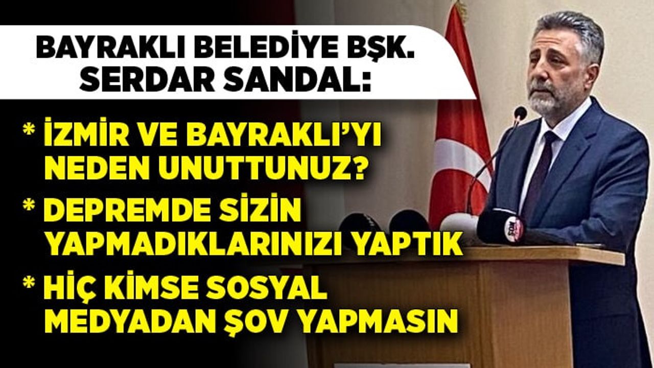 İzmir ve Elazığ’da yaşanan depremlerin ardından devlet desteklerinin iki şehre farklı uygulandığını söyleyen Sandal, aradaki farklı belgeleriyle sıraladı ve anlattı. Sandal, “İzmir’i ve Bayraklı’yı neden unuttunuz? Elazığ’a yapmışsınız. Biz de binaların orta ve az hasarlı olmasıyla ilgili yoğun bir çaba ve gayret vardı. Bizim de uyarılarımız oldu ama dinlemeyen vatandaşlarımız da oldu. Elazığ’da az ve orta hasarlı binaları ağır hasarlıya çevrilerek binalar yıkıldı, peki aradaki fark ne? Binaların hasar durumuyla ilgili beyanda bulunmak politik bir yaklaşımdır. Bu şu demek, ağır hasarlıyı üstlenirim, orta ve az hasarlı binaları size bırakırım diyorlar. Bir lobi daha oluşturmuşlar bizi topa tutan. Orta hasarlı binaların güçlendirilmesiyle ilgili… Denizin gel gidiyle oluşmuş, 30 yıl önce yapılmış binalarda güçlendirmek ne anlama geliyor bilmiyorum. Bunu maliyeti yeni binanın yüzde 80’i kadar, biz yıkın diyoruz. Biz inandığımız bu noktadan geri adım atmayacağız. Ben öğretmen çocuğuyum, kendim de öğretmenim. Emekli yurttaşlarımızın yüzde 80’nin oluşturduğu bölgeden bahsediyoruz. Bayraklı 2 milyon, Elazığ 142 milyon, iller bankası hibe destek bayraklı 1 milyon, Elazığ’a 10 milyon, bakanlık ödenekleri bayraklı 0, Elazığ 45 milyon. AFAD’ın SMS izinleri bize verilmedi, Elazığ’a verildi 140 milyon. 30-35 milyon, 560 milyon lira, nerede adalet, hani yaradılanı seviyordunuz yaradandan ötürü, hani kul hakkı yemek haramdı. Hani komşun açken yatağa tok girilmezdi, hani biz gavurduk…” şeklinde ifade etti.