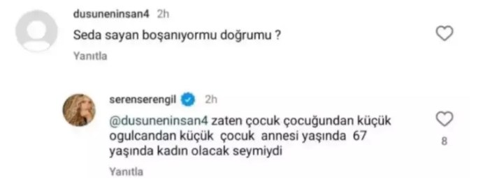 Serengil, bir takipçisinin fotoğrafının altına yaptığı "Seda Sayan boşanıyor mu?" yorumuna "Çocuk çocuğundan küçük zaten, annesi yaşında 67 yaşında kadın. Olacak şey miydi?" diyerek cevap verdi.