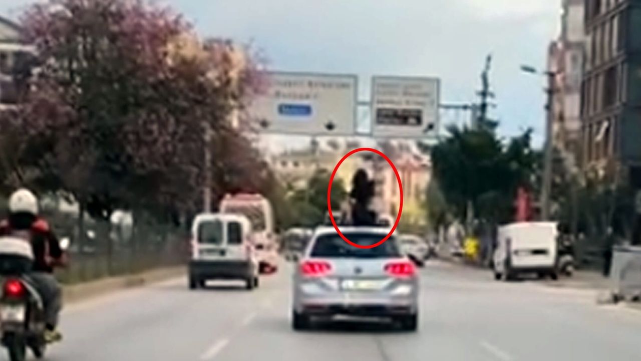 Kadın, bir süre sonra bacaklarını da dışına çıkartarak dansa devam etti. Hem kendini hem trafiği tehlike atan kadının o anları, cep telefonuyla görüntülendi.