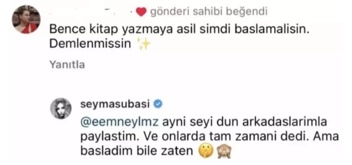 Subaşı 'Aynı şeyi dün arkadaşlarımla paylaştım. Ve onlarda tam zamanı dedi. Başladım bile zaten' yanıtını verdi.Şeyma Subaşı 2019 yılında "Sadece Şeyma" isimli bir kitap çıkarmıştı. Subaşı'nın kitabı çok eleştirilse de yok satmış ve stokları kısa süre içerisinde tükenmişti.