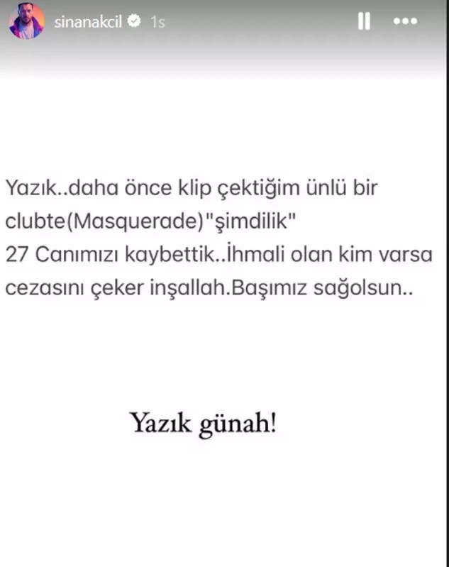 "Yazık... Daha önce klip çektiğim ünlü bir bir gece kulübünde şimdilik 27 canımızı kaybettik. İhmali olan kim varsa cezasını çeker, İnşallah! Başımız sağolsun."
