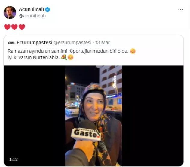 Erzurumlu olan ünlü televizyoncu Acun Ilıcalı da bu röportaja kayıtsız kalamadı. Sosyal medya hesabından röportajı yayınlayan Ilıcalı videoya kalp emojisi koydu.