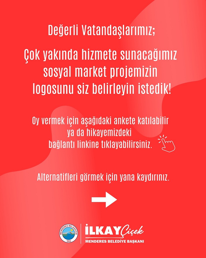 Menderes Belediyesi, mevcut ekonomik şartlarda ihtiyaç sahibi vatandaşların elini kolaylaştıracak olan sosyal market hizmetini hayata sokuyor. Yakın bir zamanda başlayacak olan hizmetin logosu düzenlenen anket ile vatandaşlar tarafından belirlenecek.