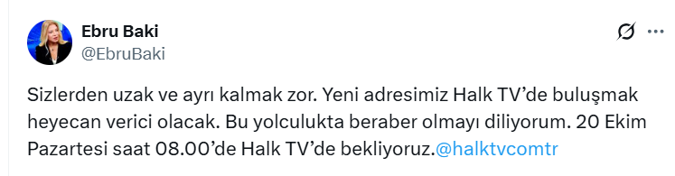 Baki, “Sizlerden uzak ve ayrı kalmak zor. Yeni adresimiz Halk TV’de buluşmak heyecan verici olacak. Bu yolculukta beraber olmayı diliyorum. 20 Ekim Pazartesi saat 08.00’de Halk TV’de bekliyoruz” diye yazdı.
