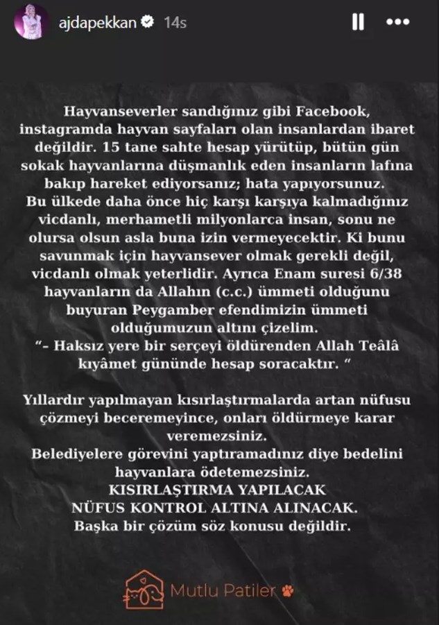 "Hayvanseverler sandığınız gibi Facebook, Instagram'da hayvan sayfaları olan insanlar değildir. 15 tane sahte hesap yürütüp bütün gün sokak hayvanlarına düşmanlık eden insanların lafına bakıp hareket ediyorsunuz. Hata yapıyorsunuz. Bu ülkede daha önce hiç karşı karşıya kalmadığımız vicdanlı merhametli milyonlarca insan, sonu ne olursa olsun asla buna izin vermeyecektir ki bunu savunmak için hayvansever olmak gerekli değil, vicdanlı olmak yeterlidir. Ayrıca Enam suresi 6/ 38 hayvanlarında Allahın ümmeti olduğunu buyuran Peygamber efendimizin ümmeti olduğumuzun altını çizelim. Haksız yere bir serçeyi öldürenden Allah Teala kıyamet gününde hesap soracaktır. Yıllardır yapılmayan kısırlaştırmalar da artan nüfusu çözmeyi beceremeyince, onları öldürmeye karar veremezsiniz. Belediyelere görevini yaptıramadınız diye bedelini hayvanlara ödetemezsiniz."