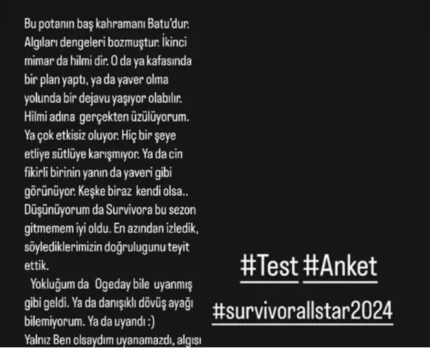 "Bu potanın başkahramanı Batu'dur. Algıları dengeleri bozmuştur.İkinci mimar da Hilmi'dir. O da ya kafasında bir plan yaptı. Ya da yaver olma yolunda bir dejavu yaşıyor olabilir. Hilmi adına gerçekten üzülüyorum. Ya çok etkisiz oluyor. Hiç bir şeye etliye sütlüye karışmıyor. Ya da cin fikirli birinin yanında yaveri gibi görünüyor. Keşke biraz kendi olsa... Düşünüyorum da Survivor'a bu sezon gitmemem iyi oldu. En azından izledik, söylediklerimizin doğruluğunu teyit ettik. Yokluğum da Ogeday bile uyanmış gibi geldi. Ya da danışıklı dövüş ayağı bilemiyorum. Ya da uyandı. Yalnız ben olsaydım uyanamazdı, algısı ben de olurdu, sanırım. Bu yıl sempati duyduğum zamanlar bile oluyor. Yokluğum Ogeday'a yaramış biraz..."