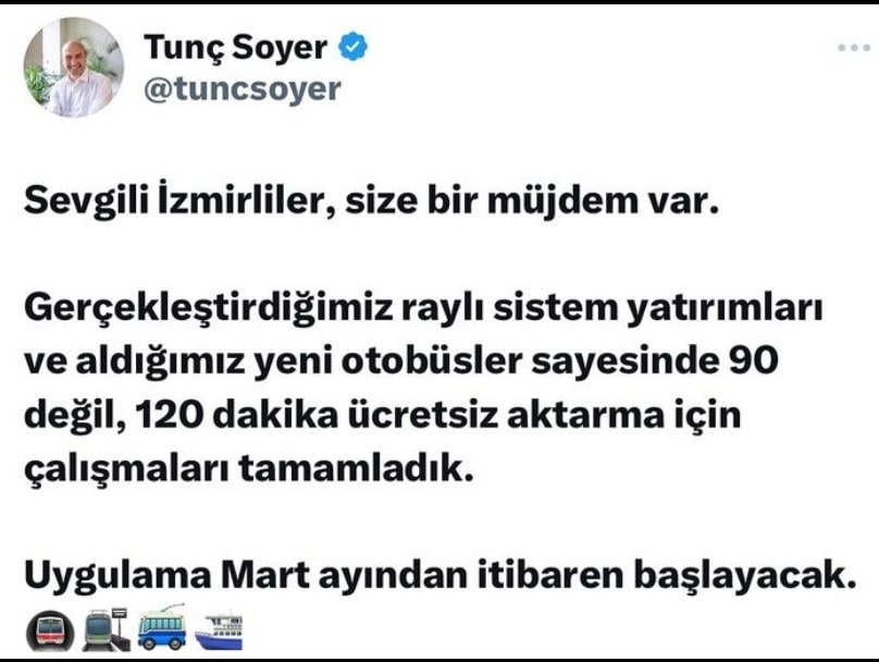 "Sevgili İzmirliler, size bir müjdem var. Gerçekleştirdiğimiz raylı sistem yatırımları ve aldığımız yeni otobüsler sayesinde 90 değil, 120 dakika ücretsiz aktarma için çalışmaları tamamladık. Uygulama Mart ayından itibaren başlayacak" dedi.