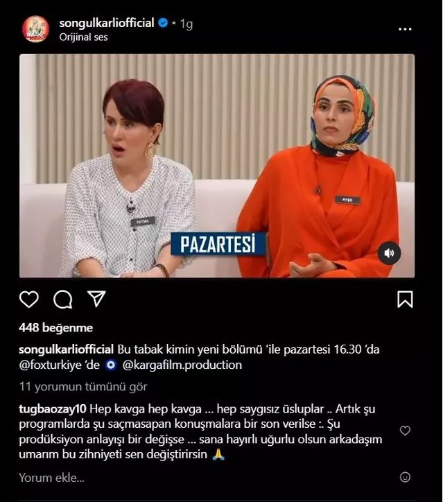 "Hep kavga, hep kavga, hep saygısız üsluplar. Artık şu programlarda şu saçma sapan konuşmalara bir son verilse. Şu prodüksiyon anlayışı bir değişse… Sana hayırlı uğurlu olsun arkadaşım umarım bu zihniyeti sen değiştirirsin."