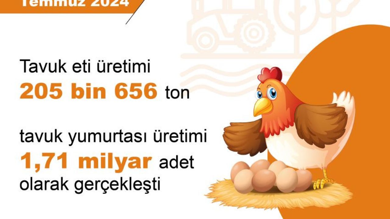 TÜİK, Temmuz 2024 dönemine ilişkin kümes hayvancılığı ile süt ve süt ürünleri üretimi verilerini açıkladı. Buna göre; temmuz ayında bir önceki yılın aynı ayına göre, tavuk yumurtası üretimi yüzde 1,4, kesilen tavuk sayısı yüzde 8,4, tavuk eti üretimi yüzde 5,5, hindi eti üretimi yüzde 0,7 arttı. Ocak-temmuz döneminde bir önceki yılın aynı dönemine göre, tavuk yumurtası üretimi yüzde 5,2, kesilen tavuk sayısı yüzde 6,5, tavuk eti üretimi yüzde 5,6, hindi eti üretimi yüzde 20,1 arttı.