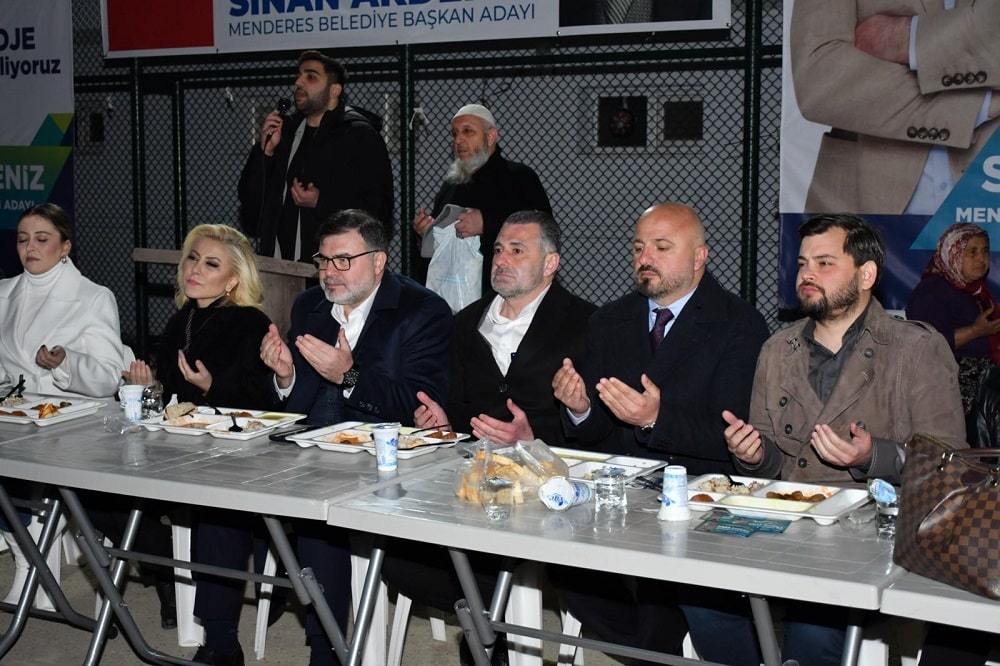 İftar yemeğinin ardından Mendereslilere seslenen AK Parti İl Başkanı Bilal Saygılı; "Sinan Akdeniz; naifliği, duruşu ve kimliğiyle gördük ki, Menderes'in gönlüne zaten taht kurmuş. Başkan olduktan sonra da bu bilinçle çalışacaktır. Tarımda, turizmde, ticarette ve ihracatta büyük adımları olacak; önemli projelere imza atacaktır.'' dedi. İzmir Milletvekili Şebnem Bursalı ise yaptığı konuşmada, Ramazan Bayramı'ndan önce bir bayram yapma çağrısında bulundu. İftara katılan binlerce Menderesli'ye seslenen Bursalı; " Bu bayramı birlikte yapalım. Sinan Akdeniz'i seçerek; Ramazan Bayramı'ndan önce bir bayram yapıyor muyuz?" deyince, büyük alkış aldı. MKYK Üyesi Emre Cemil Ayvalı ise; ilçenin Akdeniz'in dokunuşuyla yükseleceğini belirtti. Ayvalı şöyle konuştu; "Menderes, taşıdığı potansiyelle, bu boş vermişliği hak etmiyor. Menderes, ancak, Sinan Akdeniz'in elinde yoğrulursa çok daha güzel bir yer olacak." açıklamasında bulundu.