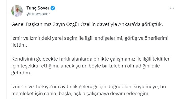 Genel Başkanımız Sayın Özgür Özel’in davetiyle Ankara’da görüştük. İzmir ve İzmir'deki yerel seçim ile ilgili endişelerimi, görüş ve önerilerimi ilettim. Kendisinin gelecekte farklı alanlarda birlikte çalışmamız ile ilgili teklifleri için teşekkür ettiğimi, ancak şu an böyle bir talebim olmadığını dile getirdim. İzmir'in ve Türkiye'nin aydınlık geleceği için doğru olanı söylemeye, bu memleket için canla, başla, aşkla çalışmaya devam edeceğim.