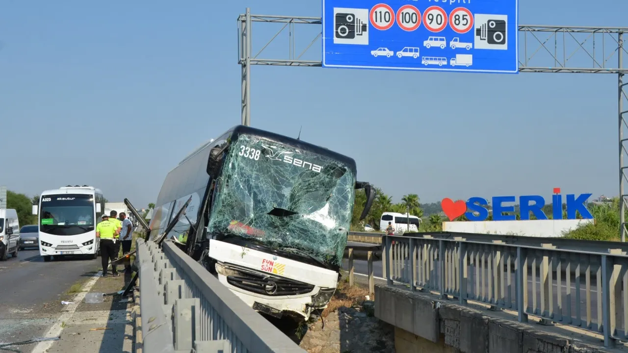 Kaza, sabah saatlerinde Antalya- Alanya D400 kara yolu Aspendos Köprüsü'nde meydana geldi. Antalya Havalimanı'ndan aldığı 34 turisti 10 ARR 495 plakalı tur otobüsüyle Manavgat ve Alanya ilçelerindeki otellerine taşıyan Şeref D., direksiyon kontrolünü yitirdi. Yoldan çıkıp refüjdeki demir bariyerleri parçalayan otobüs, yaklaşık 100 metre ilerledi. Duble yol üzerinde kurulu, altından Köprüçay Irmağı akan köprünün korkuluklarına çarpan otobüs, yaklaşık 30 metre yükseklikten düşmeye ramak kala durdu. Otobüsteki sürücü, rehber ve turistler kazayı yara almadan atlattı.