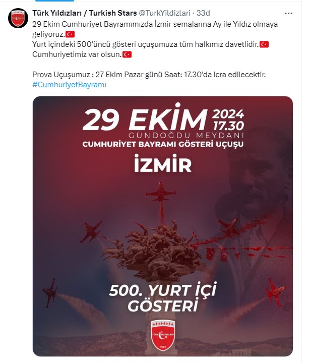 Türk Yıldızları'nın sosyal medya hesabından yaptığı açıklamaya göre İzmir'de 29 Ekim'de yapılacak olan gösteri uçuşunu vatandaşlar Gündoğdu Meydanı'ndan izleyebilecek.