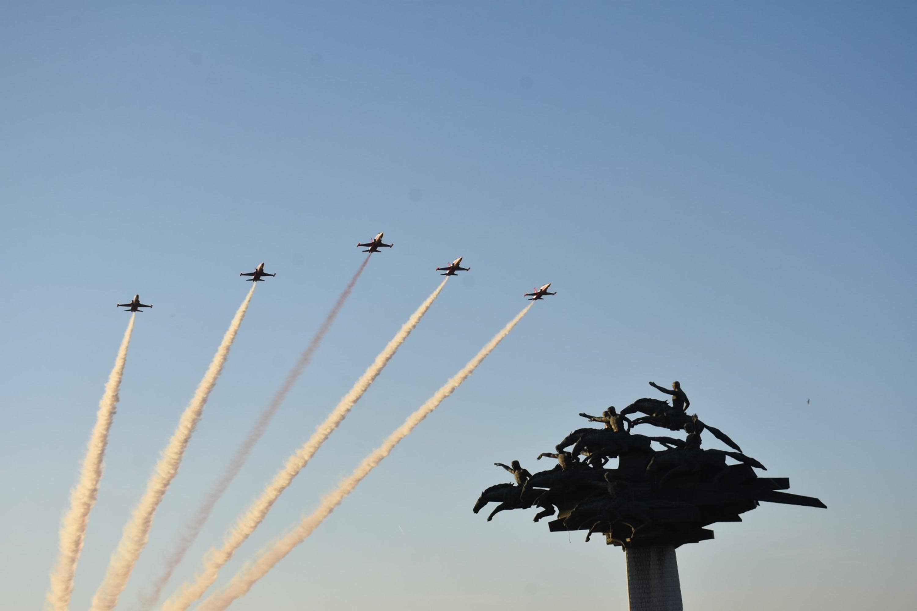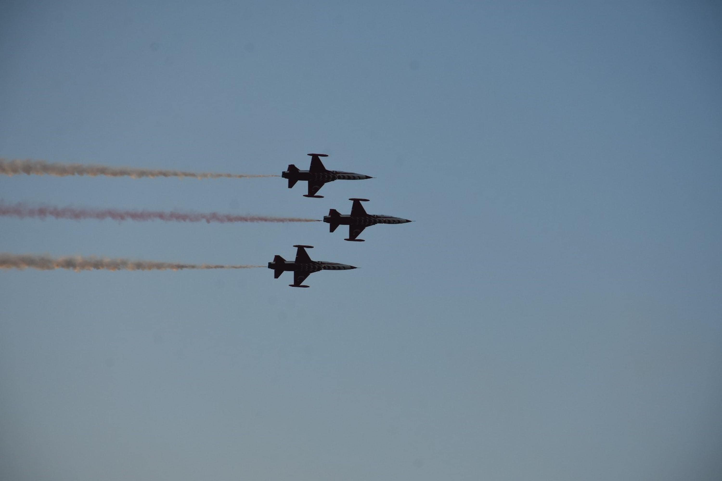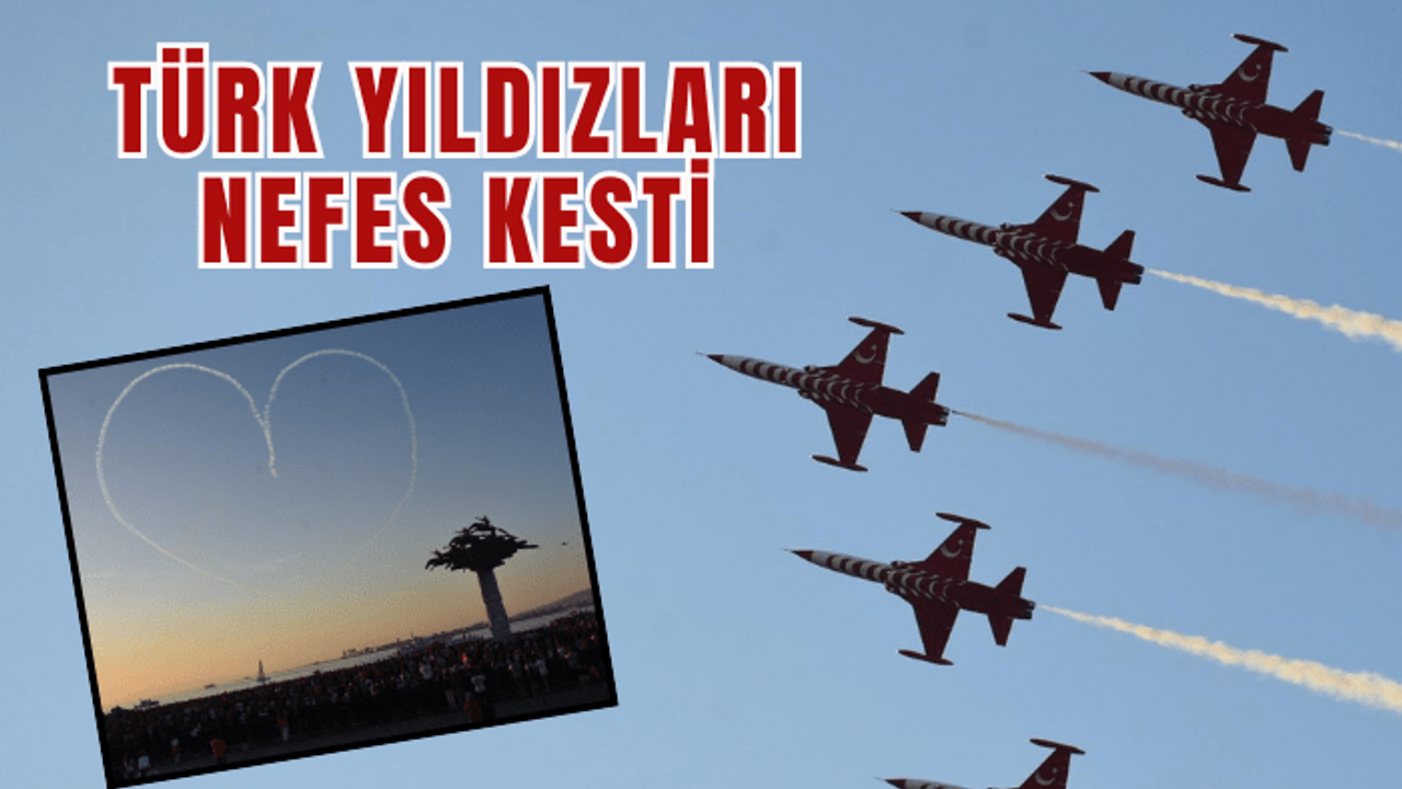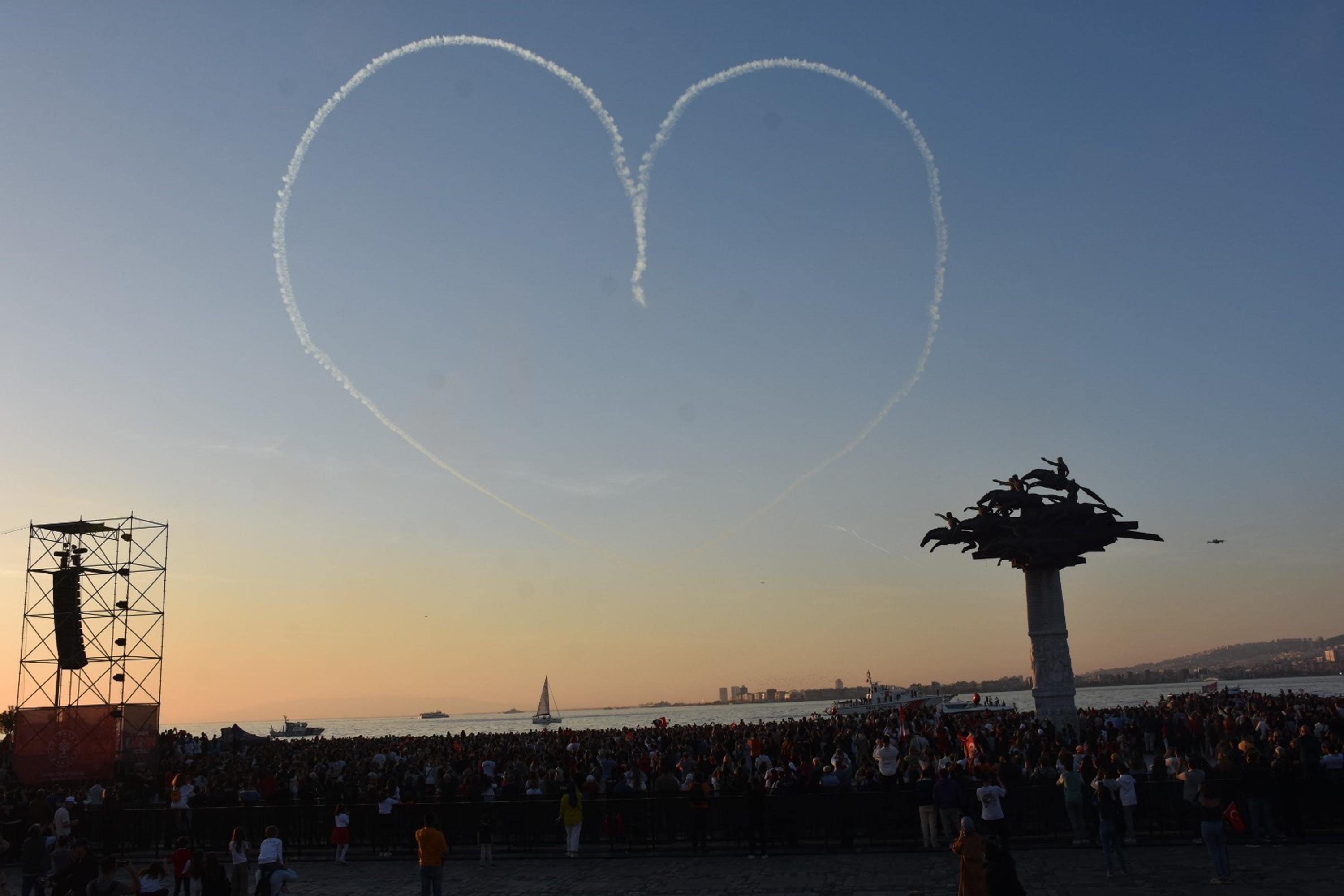 Türk Hava Kuvvetleri'ne bağlı akrobasi timi Türk Yıldızları, alçak uçuş ve gerçekleştirdikleri hassas manevralarla heyecan yarattı. 7'den 70'e İzmirliler gösteri boyunca nefeslerini tuttu. Türk Yıldızları'nın yetenekli pilotları İzmir Körfezi'nin üzerine gökyüzüne kalp de çizdi.