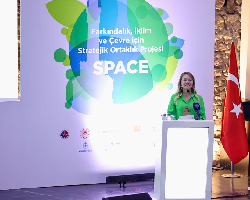 Konuşmasının başında geçtiğimiz günlerde İzmir'de meydana gelen orman yangınları dolayısıyla geçmiş olsun dileklerini ileten Sosyal İklim Derneği Başkanı Gaye Tuğrulöz ise "İklim krizi ile mücadele etmek için 10 senedir birçok proje yürüyoruz. Konak Belediyesi ile de uzun süreli iş birliğine sahibiz, hali hazırda iki tane AB desteği ile gerçekleştirdiğimiz iklim krizi odaklı projelerimizi yürütmekteyiz. SPACE bizim için çok kıymetli bir proje. Çıkış noktamız olan iklim krizi, bu neslin en büyük sorunu ve bir çevre hakkı ihlali. Buradan yola çıkarak çocukların ve gençlerin daha fazla farkındalık sahibi olabileceği, daha çok birbirleriyle çalışarak örgütlenerek, dayanışarak karar alabilecekleri bir merkez oluşturmak istedik. Bugün burada siz belediye temsilcilerimizin deneyimlerini aktardığı ve bizlerin de öğleden sonra yapacağı atölye çalışması ve yarı burada çocuk, genç aktivistlerin de sizlere ileteceği mesajlarla beraber zirvemizin çıktılarını birleştirmek ve eylül, ekim ayı içerisinde açılışını yapmayı planladığımız İklim Eğitim Merkezi'nde bu deneyimleri çocuklara ve gençlere aktarmak istiyoruz. Buradan çıkan sonuçlarla beraber çocukların ve gençlerin daha yaşanabilir Konak, daha yaşanabilir bir İzmir için beraber projeler, etkinlikler ve faaliyetler gerçekleştirmesi için onları desteklemek istiyoruz. Bizlerden desteğini hiç esirgemeyen Konak Belediye Başkanımız Nilüfer Çınarlı Mutlu'ya çok teşekkür ediyorum" ifadelerini kullandı.