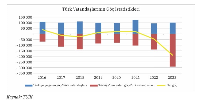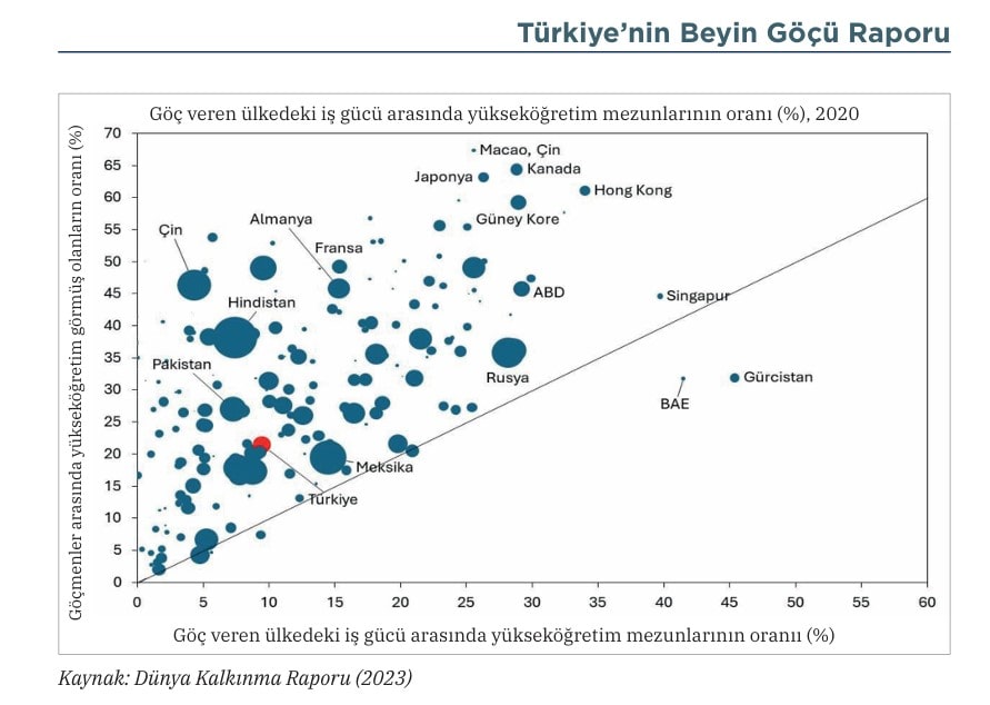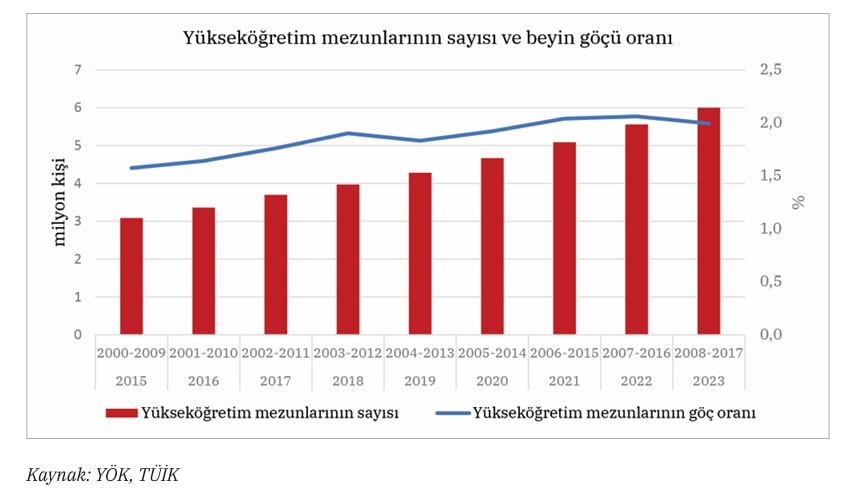 Türkiye’nin Beyin Göçü raporunda, 2020 yılı itibariyle Türkiye'nin işgücünü oluşturan kişiler arasında yükseköğretim mezunlarının oranı yüzde 9.4 iken göç edenler arasında bu oran yüzde 21.4'e yükseldiği ifade edildi.