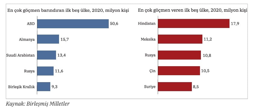 En çok göç alan ilk beş ülke ABD, Almanya, Suudi Arabistan, Rusya ve Birleşik Krallık olarak verilere yansıdı. En çok göç veren ilk beş ülke ise Hindistan, Meksika, Rusya, Çin ve Suriye. 2020 senesi itibariyle göçmenlerin yüzde 84’ü kendi ülkelerinden daha zengin bir ülkede yaşıyor.