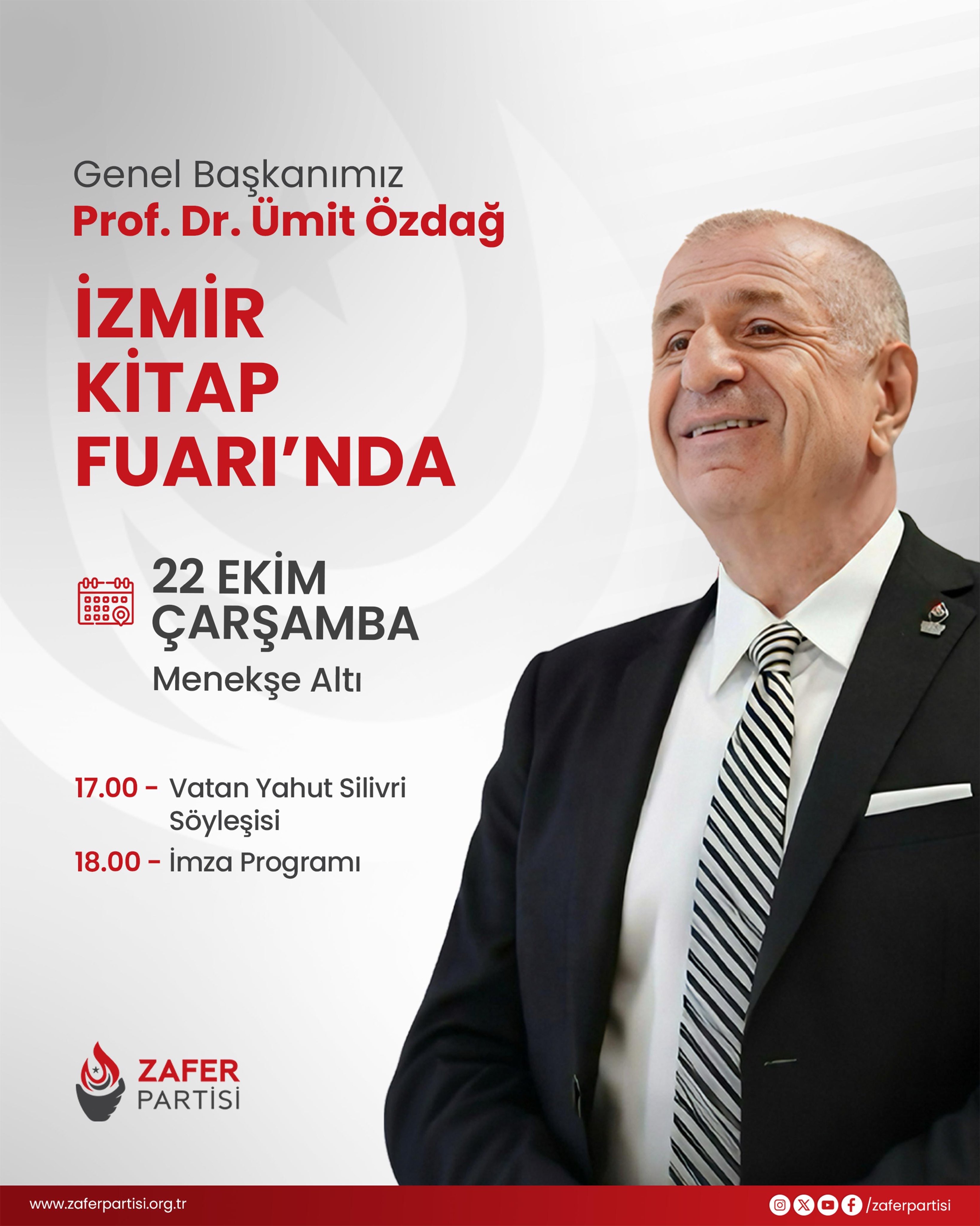 Zafer Partisi Genel Başkanı Ümit Özdağ bir dizi program için İzmir'e geliyor. Prof. Dr. Ümit Özdağ, 22 Ekim Çarşamba günü İzmir Kitap Fuarı kapsamında, Menekşe Altı Salonu'nda saat 17.00’de “Vatan Yahut Silivri” söyleşisi gerçekleştirecek ve ardından saat 18.00’de imza programına katılacak.