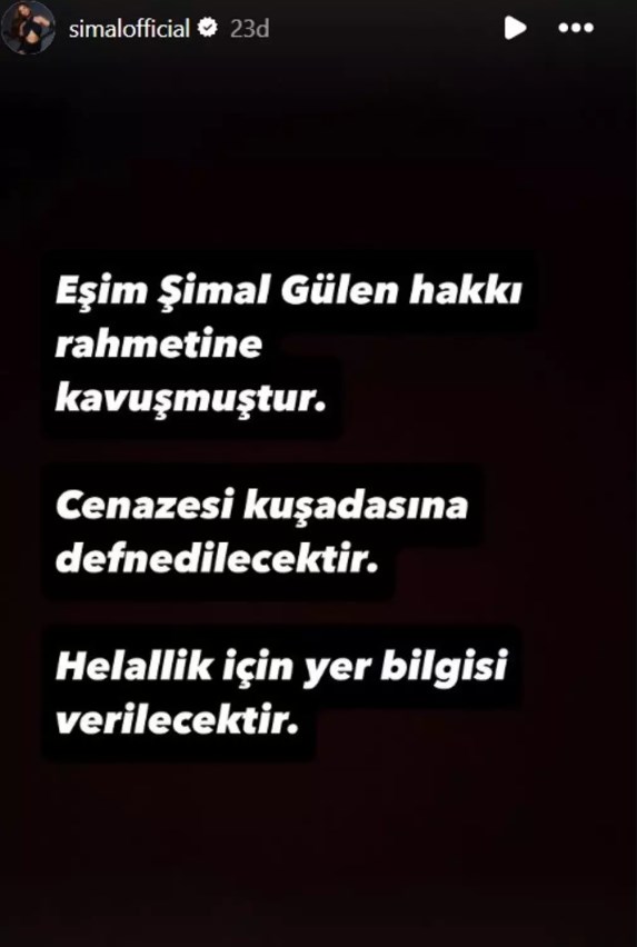 Ancak az önce Necati Arıcı, Şimal'in sosyal medya hesabından; "Eşim Şimal Gülen hakkı rahmetine kavuşmuştur. Cenazesi, Kuşadası'nda defnedilecektir. Helallik için yer bilgisi verilecektir" açıklamasını yaptı.