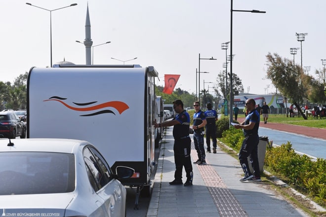 “Karavanların yüzde 70’i plakasız çekme karavan” Karavan denetimleri kapsamında özellikle İnciraltı ve Bostanlı bölgelerinde son yıllarda iyi bir çalışma yapıldığını vurgulayan Toprakdeviren, “Karavanların tahliye edilmesi hususunda tebligatlara başlamıştık. Bu kapsamda İnciraltı’nda 259 karavan tahliye edilirken, Karşıkaya’da ise 174 karavan tahliye edildi” diye konuştu. İzmir genelinde 3 bin 829 karavan tespitinin yapıldığını ancak zabıta ekiplerinin Karşıyaka, Bornova, Bayraklı bölgesinde yaptığı tespitlerde plakalı karavan sayılarının az olduğunu söyleyen Toprakdeviren, “3 bin 829 karavanın yüzde 70’i çekme karavan ve 750 kilonun altında plakasız karavanlar. Çekme karavanlar yasal olarak kaldırılamıyor” bilgisini verdi.