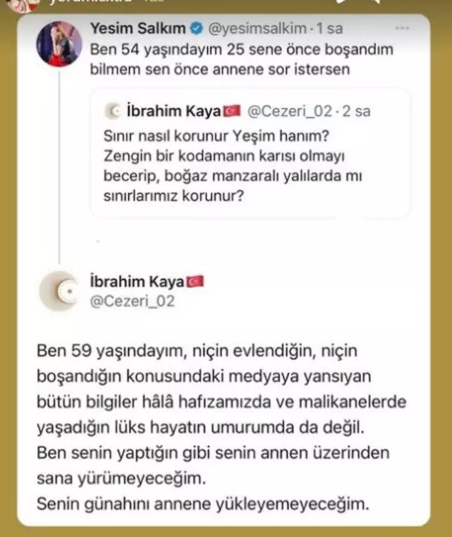 Takipçi ise bu yoruma da sessiz kalmadı ve "Ben senin yaptığın gibi senin annen üzerinden sana yürümeyeceğim" deyince Yeşim Salkım bu kullanıcıya "S.. git sayfamdan" diyerek tepki gösterdi.