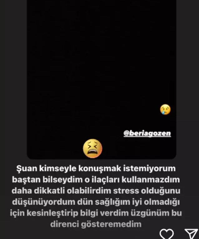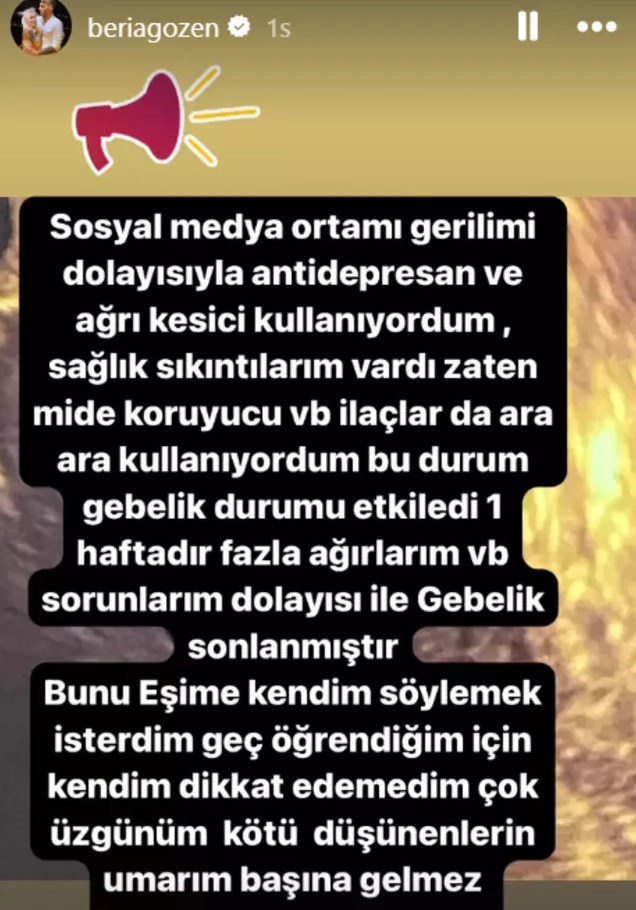 Beria Özden şu ifadeleri kullandı: "Sosyal medya ortamı, gerilimi dolayısıyla antidepresan ve ağrı kesici kullanıyordum. Sağlık sıkıntılarım vardı zaten mide koruyucu vb. ilaçlar da ara ara kullanıyordum. Bu durum gebeliği etkiledi. 1 haftadır fazla ağrılarım vb. sorunlarım dolayısıyla gebelik sonlanmıştır. Bunu eşime kendim söylemek isterdim geç öğrendiğim için kendim dikkat edemedim çok üzgünüm. Kötü düşünenlerin umarım başına gelmez."